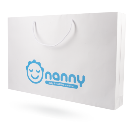 Torba reklamowa papierowa z logo Nanny, idealna do zapakowania jedengo monitora oddechu lub zestawu monitora oddechu wraz z dodatkowa płytka sensoryczną.